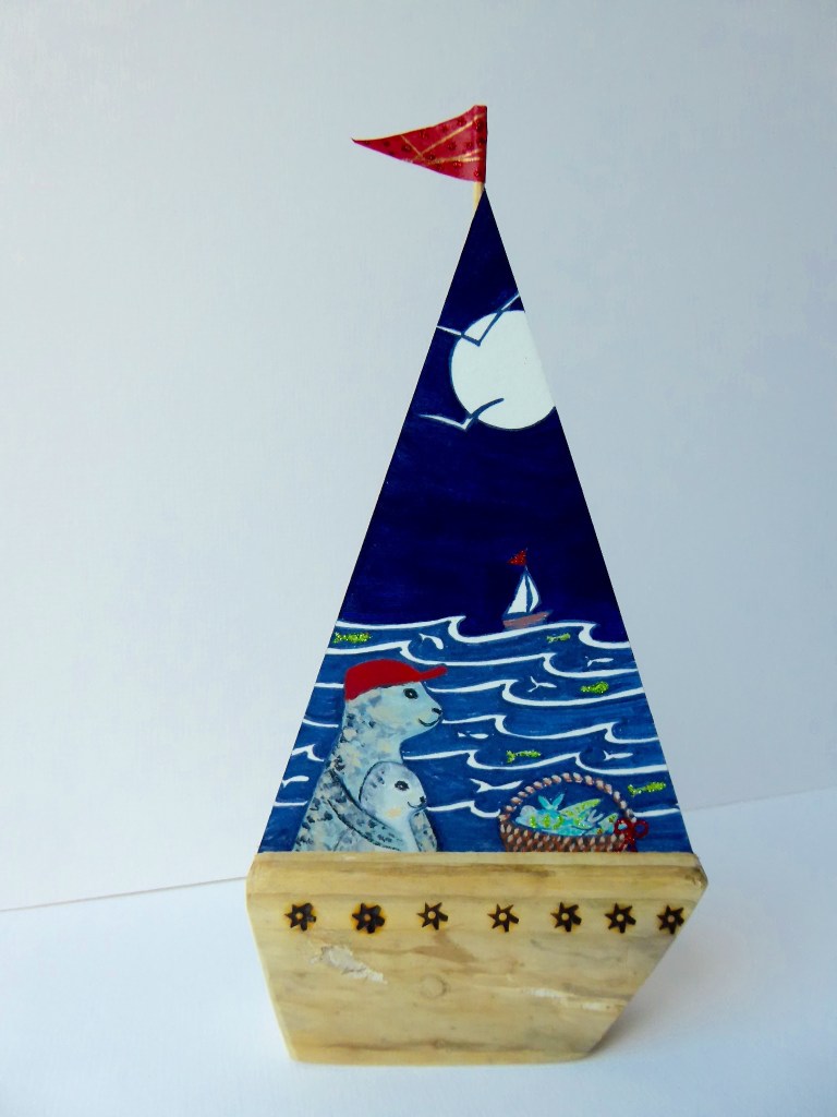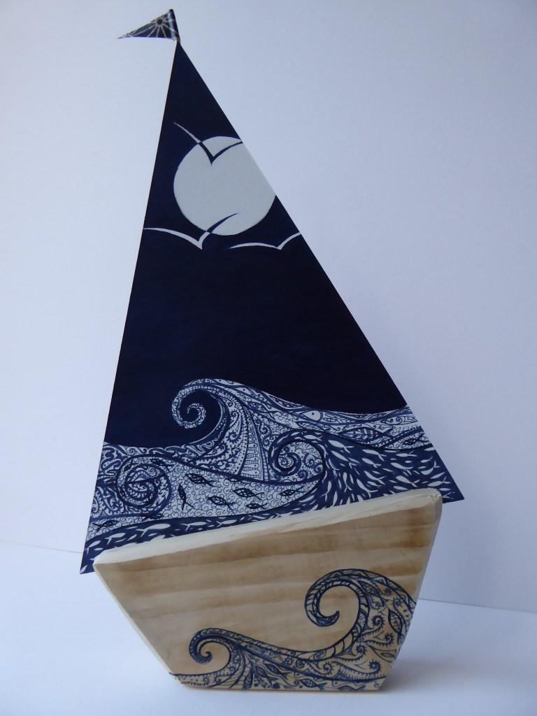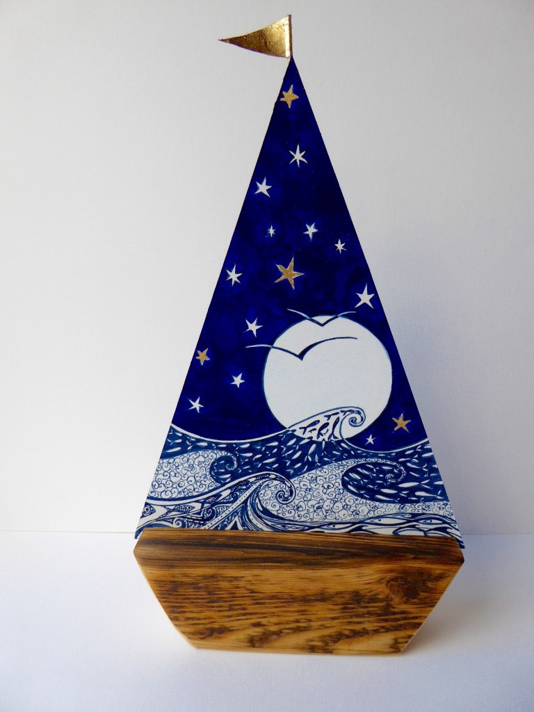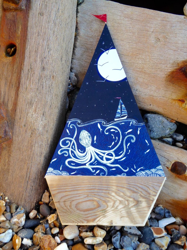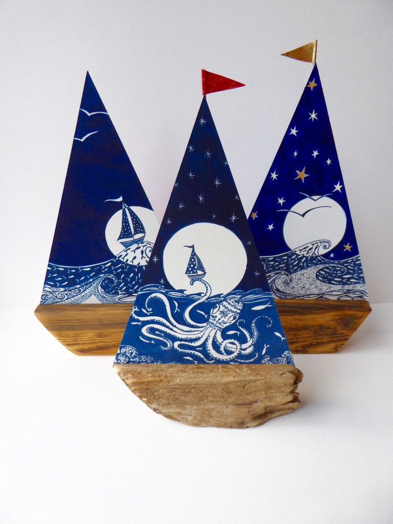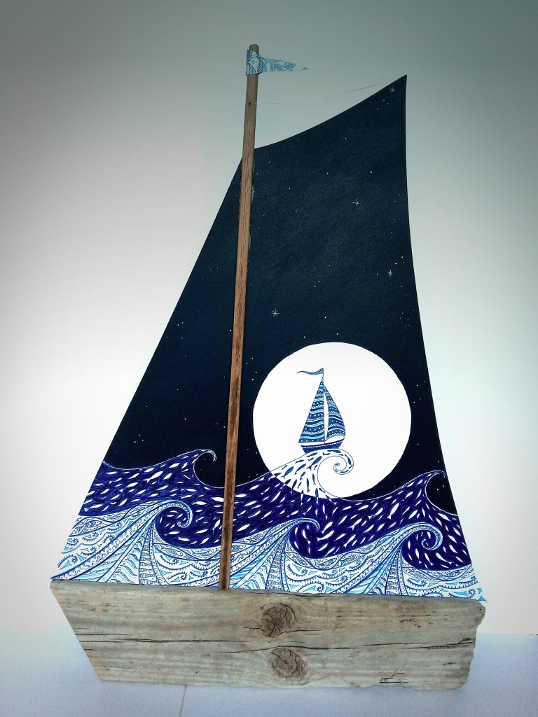I love to paint with bright and vibrant colours using bold illustrative imagery. I’m often inspired by the sea, I love watching it’s ever changing mood, energy and colour. It’s whilst following this theme back in 2016 I started to create unique, hand painted sailboats, where the sail becomes my canvas.
