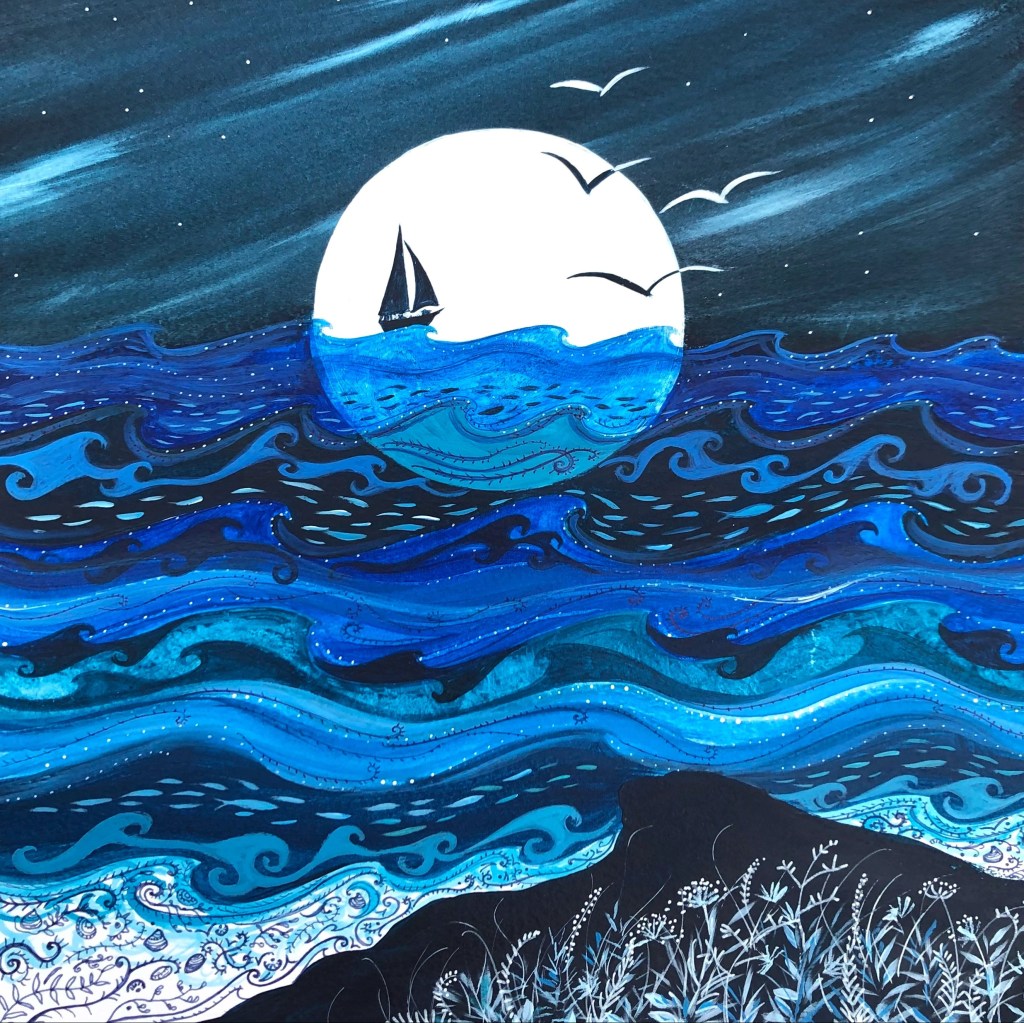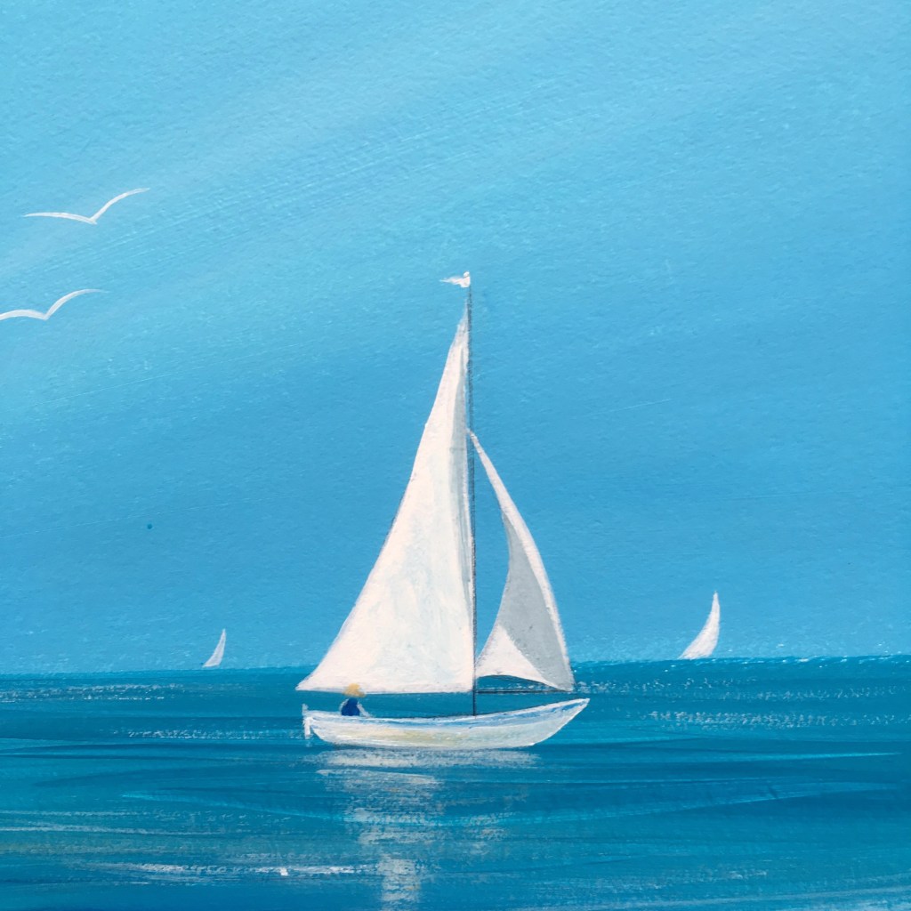I love to paint with bright and vibrant colours using bold illustrative imagery. I’m often inspired by the sea, I love watching it’s ever changing mood, energy and colour. It’s whilst following this theme back in 2016 I started to create unique, hand painted sailboats, where the sail becomes my canvas.